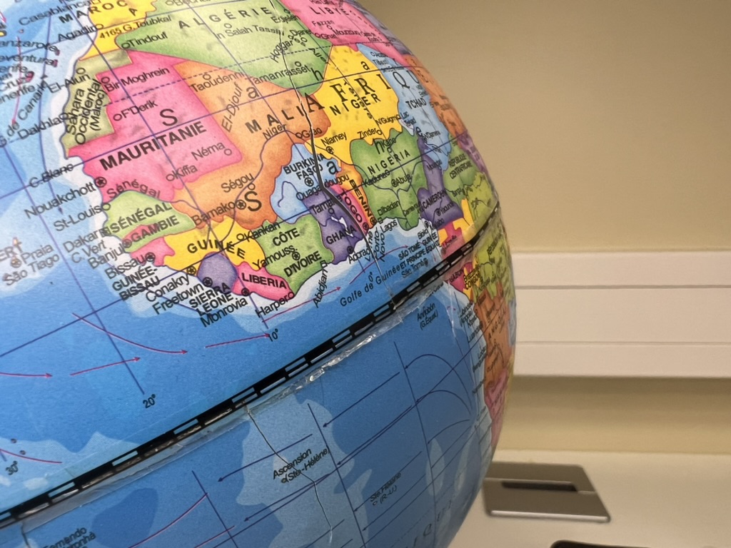 Päeval jälgige maakera koos poliitiliste piiridega, meresid, mägesid ja linnu.